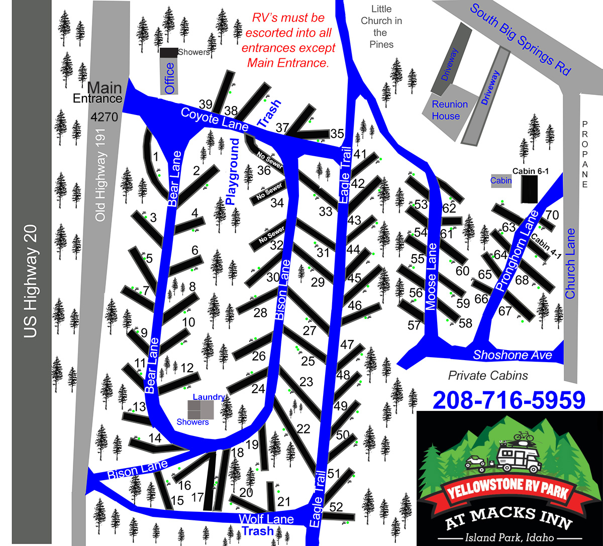 - 29 & 27: These are pull-thrus with plenty of room between them for sharing. Add 46, or 28 for additional RVs.