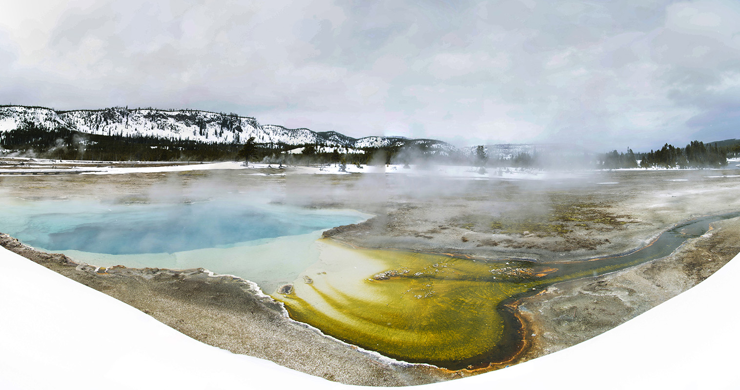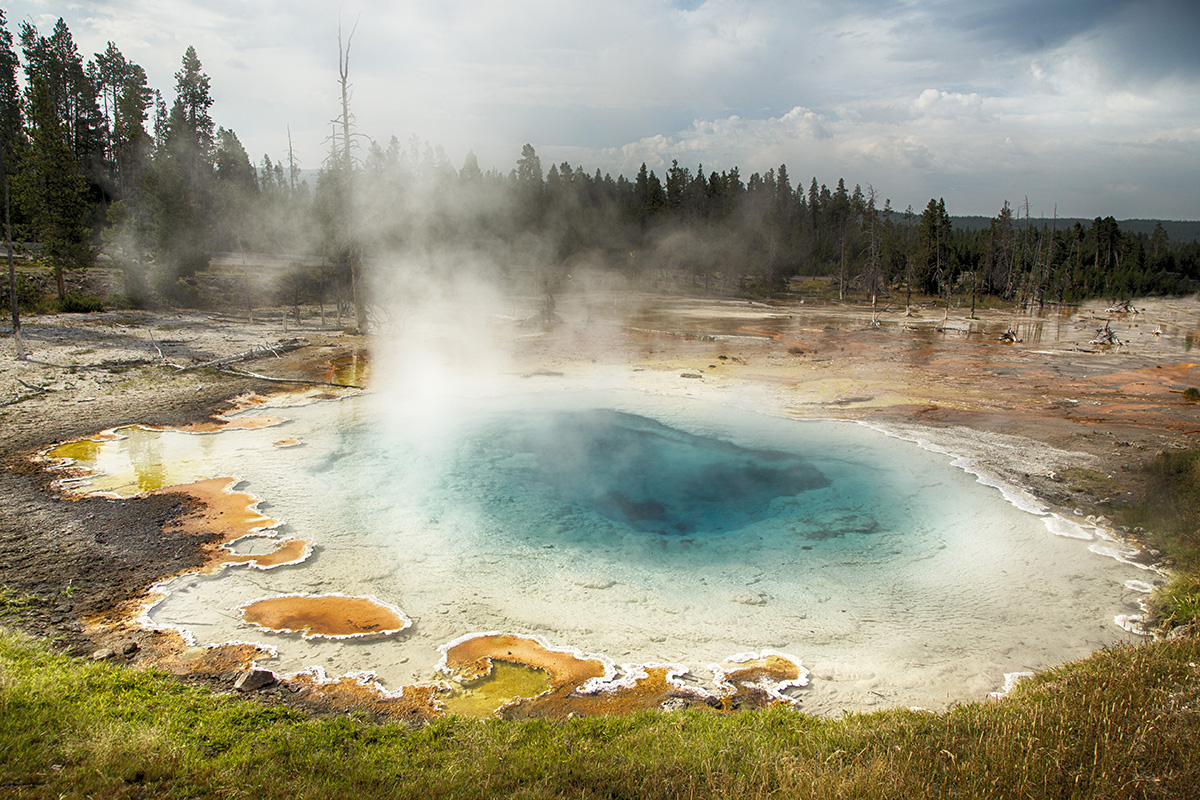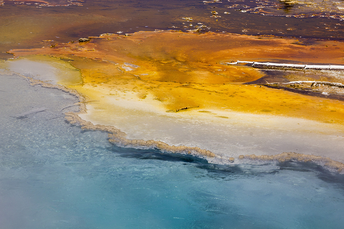 Silex Spring - see image above. Silex Spring is named for the large amount of silica found in and around this feature. This silica is then deposited as sinter, which lines the pool and forms terraces along the runoff channels . Thermophiles thrive in these hot waters, which in turn give the channels such a variety of textures and colors. Silex Spring has an average temperate of 174.7°F.