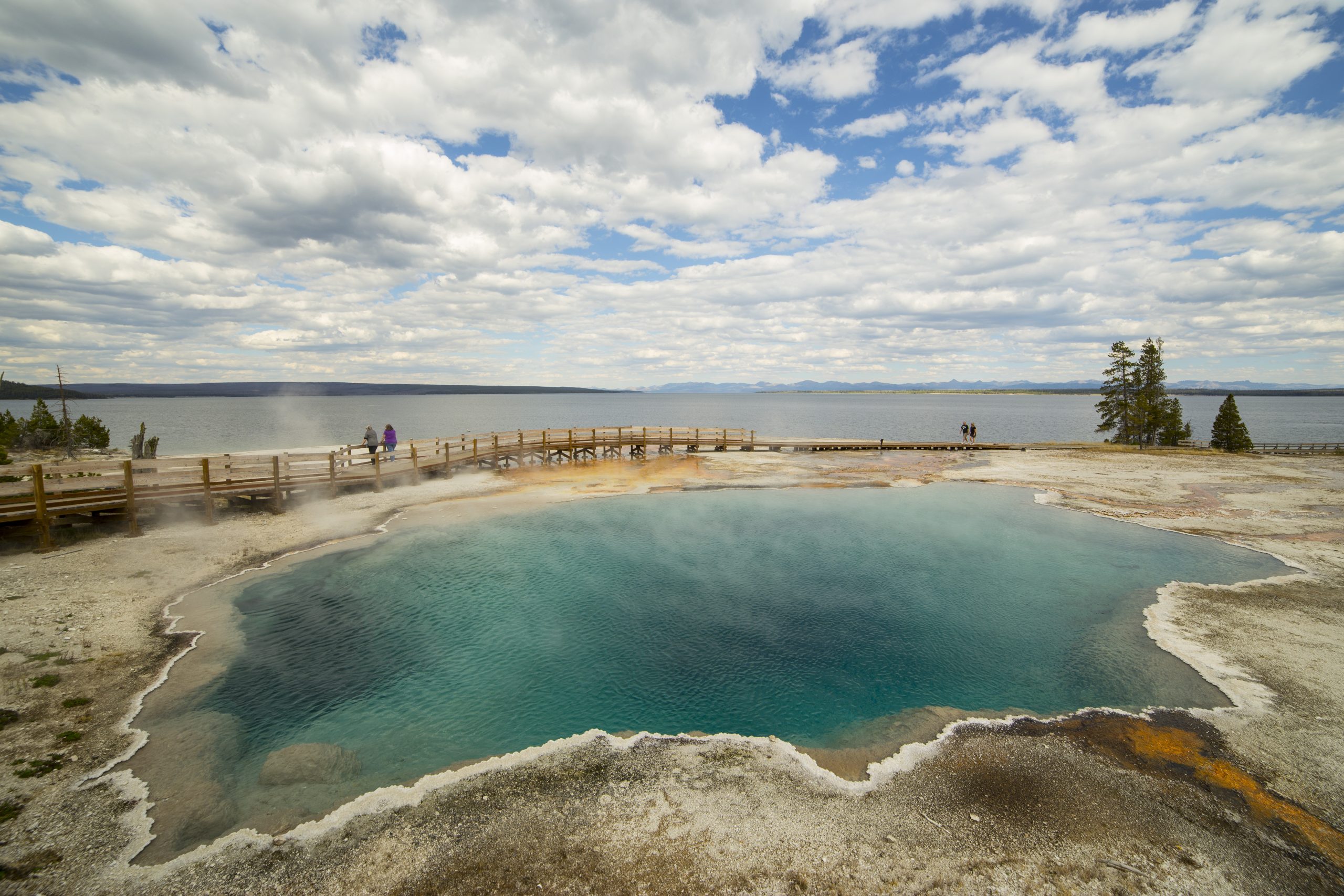 This interesting area of thermal activity is on the western edge of Yellowstone Lake. There aren't any active geysers here, just thermal pools. There is a boardwalk that leads you around the main features here. Abyss Pool and Black Pool are deep thermal pools of beauty and interest. Black Pool (image above) was named for the green and brown thermophiles living in the pool back when it was given this name. Since then, however, the temperature of the water has increased, and the types of thermophiles living in the pool has shifted to those more orange and yellow in color. Probably what makes this area most interesting is that it borders the large Yellowstone Lake. There are two loops, one to the left and one to the right. The most interesting is to the left as it borders the lake more. This is also one of lesser visited areas of the park.