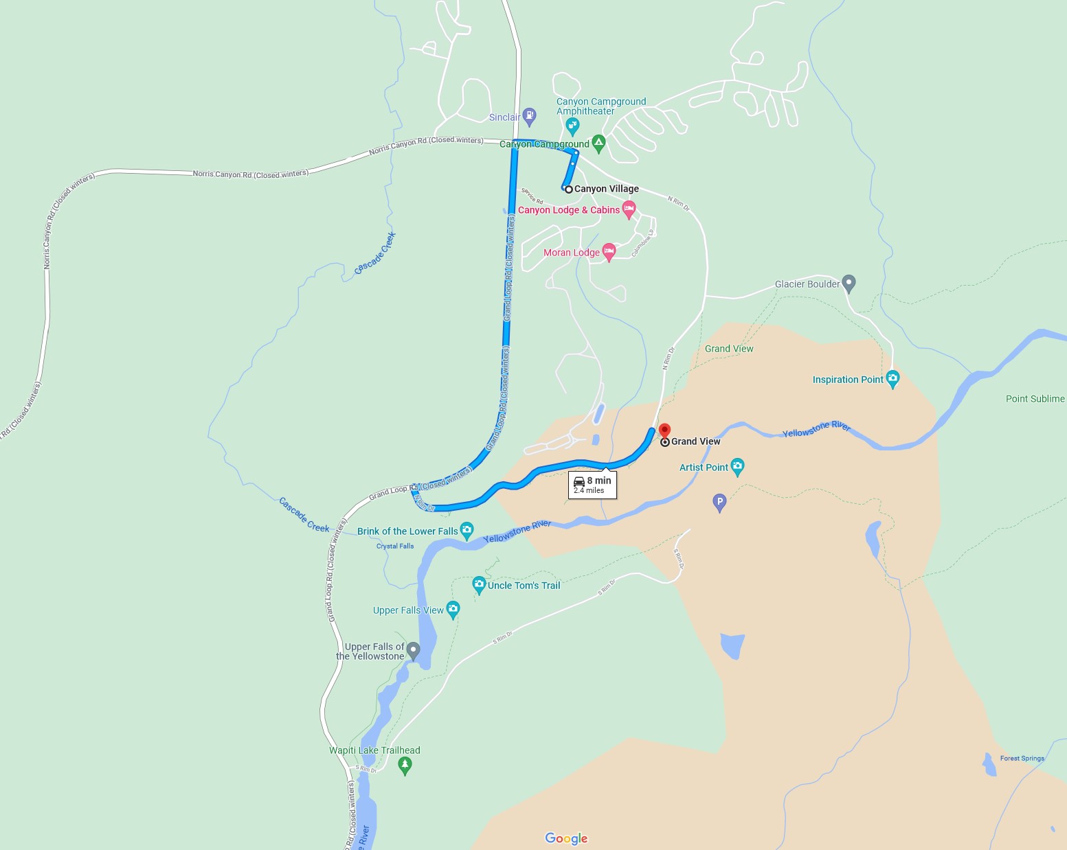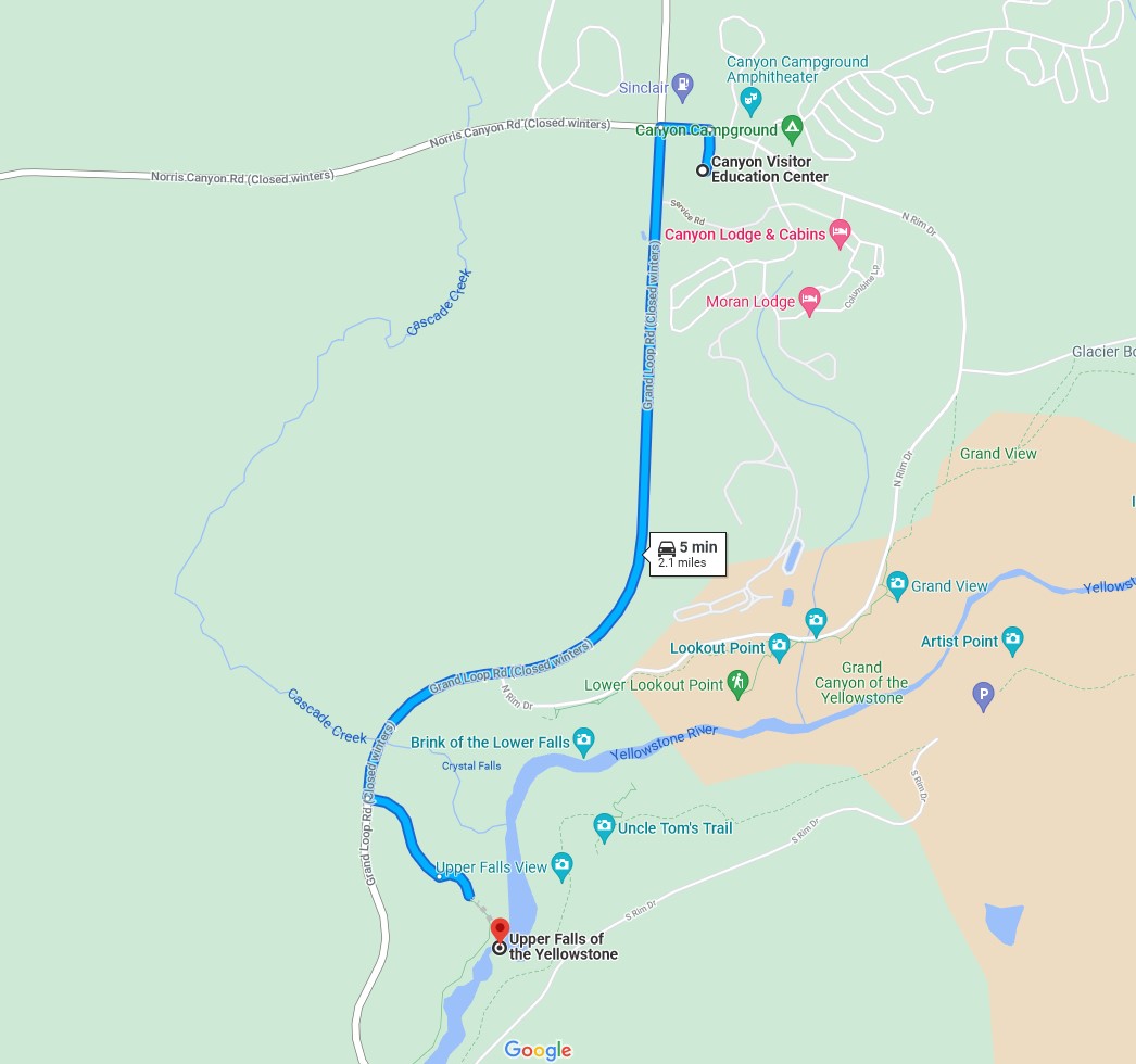 They are in the Canyon area and many different views of the falls and the canyon can be seen along the North and South Rim drives. They are about a 1.75 hour ride from our RV Park when the traffic is light. It's worth spending a couple hours in this area.