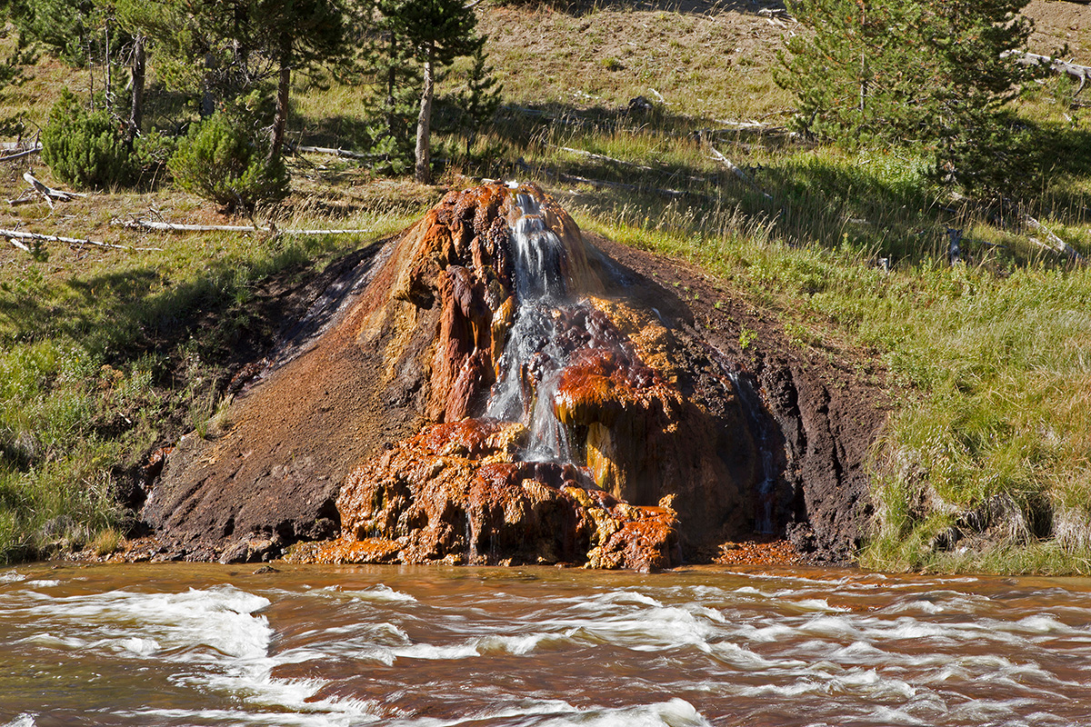 The Chocolate Pots are colorful and unusual formations located along the Gibbon River and the road between Elk Park and Gibbon Meadows. They are unique for their rich, dark-brown, chocolate color. The three to four-feet-high cones have green, yellow, brown and orange streaks formed by warm, water loving bacteria and algae. Mineral oxides are responsible for the dark-brown color. Iron, aluminum, nickel and manganese oxides compose nearly 60% of the pots, with silica composing an additional 17%.