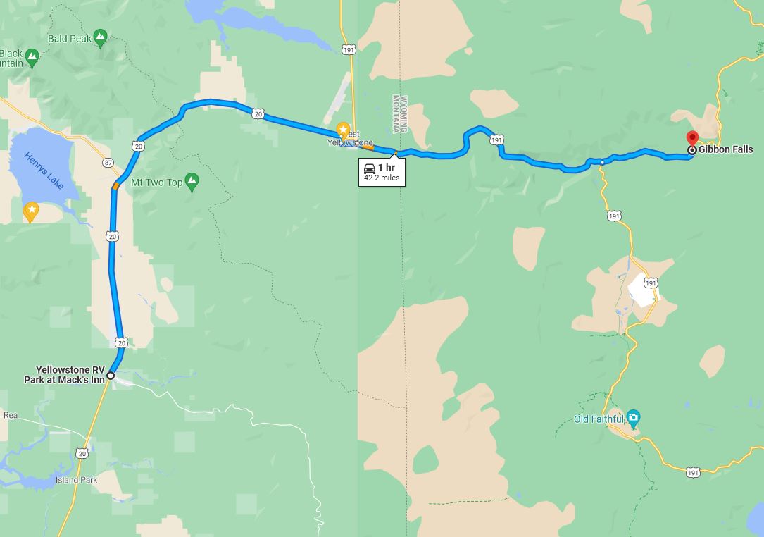 Gibbon Falls is about a 1.2 hours drive from our RV Park.