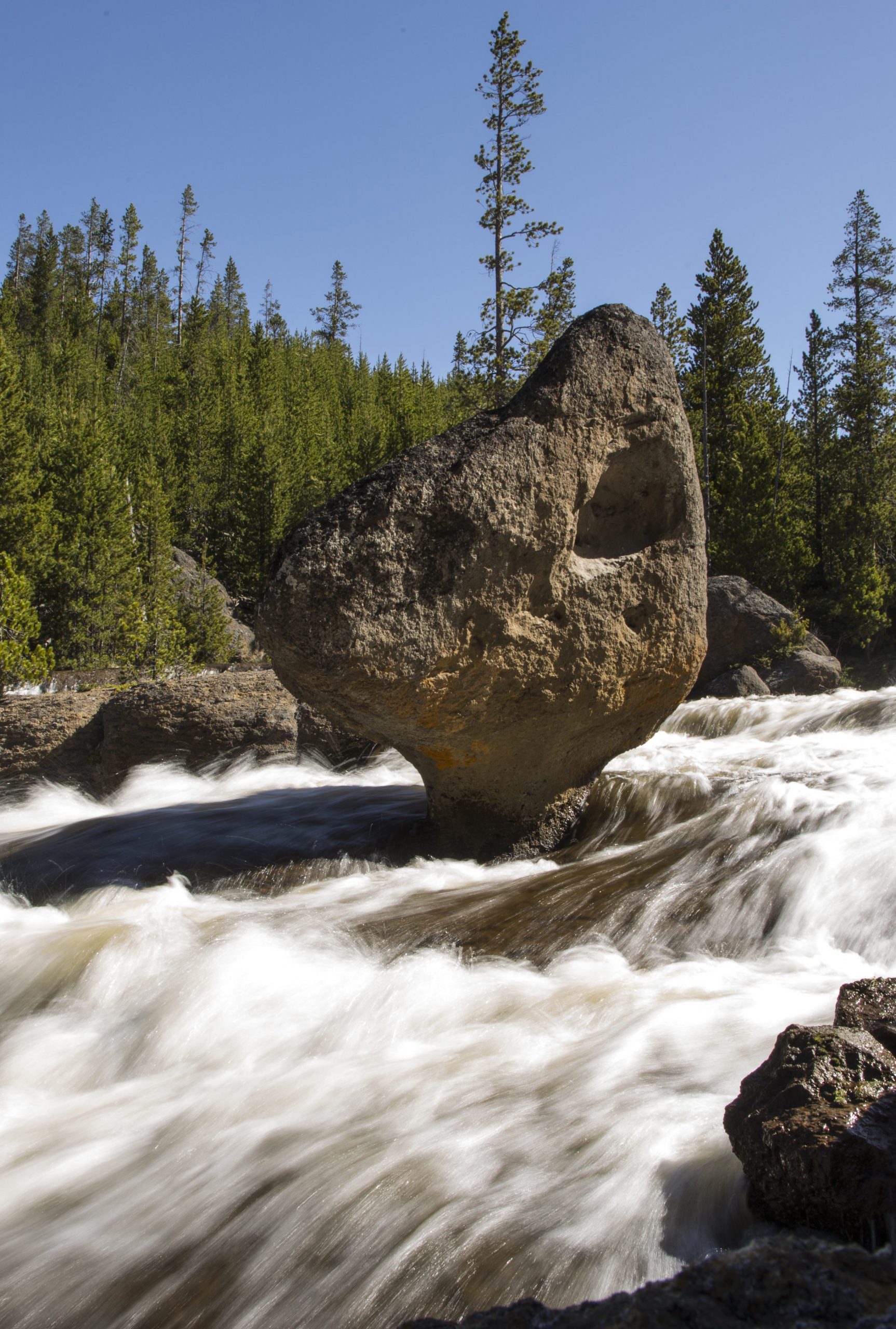 There is a pull-off on the road from Madison Jct to Norris along the Gibbon River that the pots can be seen. The very next pull off allows views of Duck Rock, if you get out of the automobile and peer through the trees. This unusual balanced rock formation sits in a very beautiful stretch of the Gibbon River rapids.
