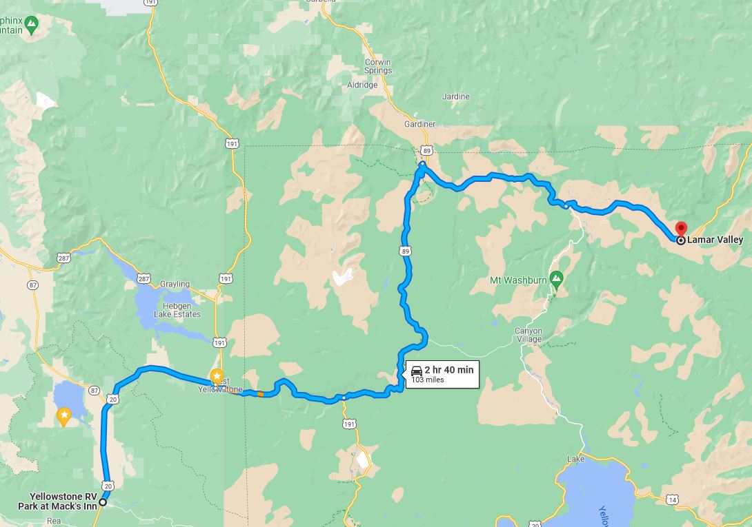 The Lamar Valley is about 2.75 hours drive through Yellowstone from our RV Park.