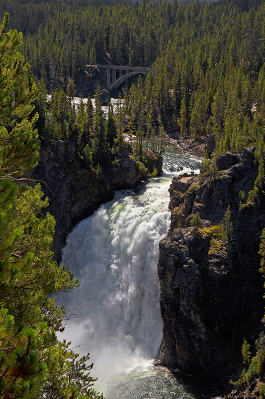 These falls are the first of two that empty out of Yellowstone Lake. Although the Lower Falls is almost 3 times the height of the Upper Falls at 109 feet (33 m) high they are still impressive as you stand over them. The brink of the Upper Falls marks the junction between a hard rhyolite lava flow and the weaker glassy lava that has been more heavily eroded. You can stand at the brink of the falls by stopping along the first stop of the North Rim drive and taking a short walk down to the overlook. A more distant view can be had from the Uncle Tom Overlook on the South Rim Road.